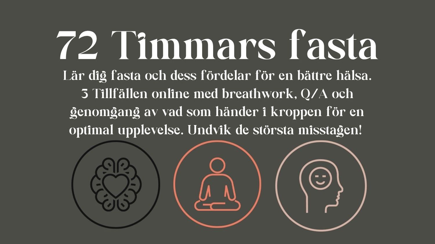 Joina mig under 72 timmar dĂ€r jag guidar dig igenom en fasta. Vad du behöver tĂ€nka pĂ„, vad du inte ska göra, vad du borde göra och hur du fĂ„r ut det mesta av upplevelsen. Vi kommer att ses digital i grupp under 3 kvĂ€llar dĂ€r jag förklarar vad som hĂ€nder i kroppen och vad som Ă€r vĂ€rt att tĂ€nka pĂ„ det kommande dygnet. Jag kommer ocksĂ„ att hĂ„lla en kort breathwork för att verkligen balansera kropp, sinne och sjĂ€l samt att du fĂ„r en chans att stĂ€lla frĂ„gor kring fastan, alltsĂ„ en Q/A.Â